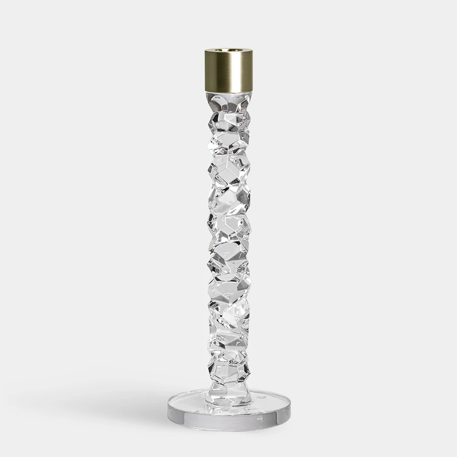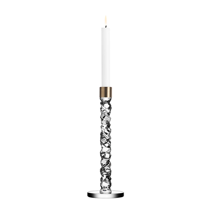 The Carat collection is based on a contemporary interpretation of the traditional cut glass for which Orrefors is world-renowned. The irregular geometry produces beautiful reflections of light in the crystal. The large candlestick in clear glass is available with details in brass. Designed by Lena Bergström.