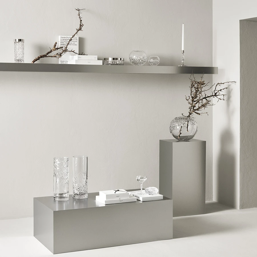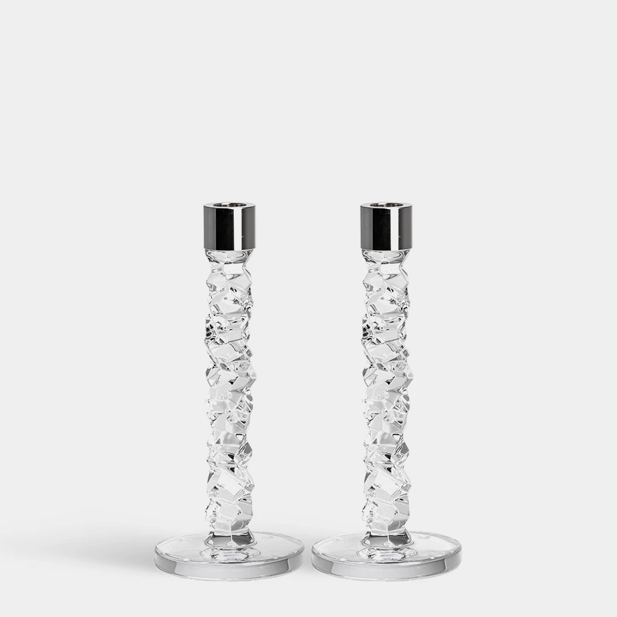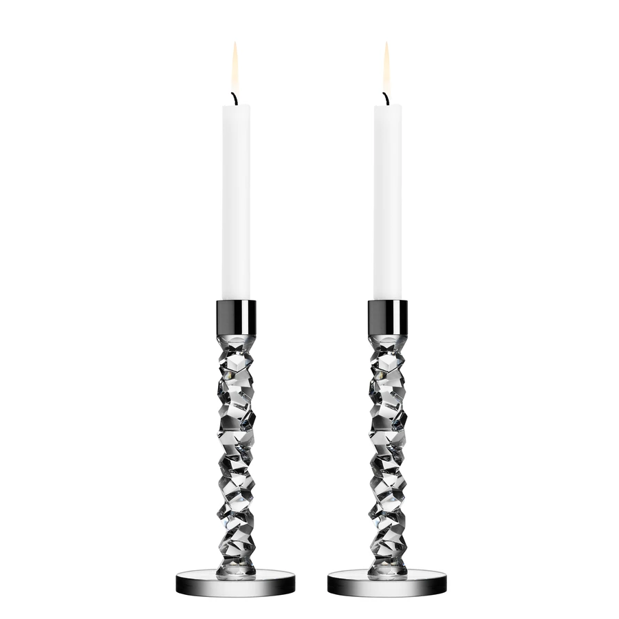 The Carat collection is based on a contemporary interpretation of the traditional cut glass for which Orrefors is world-renowned. The irregular geometry produces beautiful reflections of light in the crystal. The medium candlestick in clear glass is available as a set of 2 with details in stainless steel. Designed by Lena Bergström.