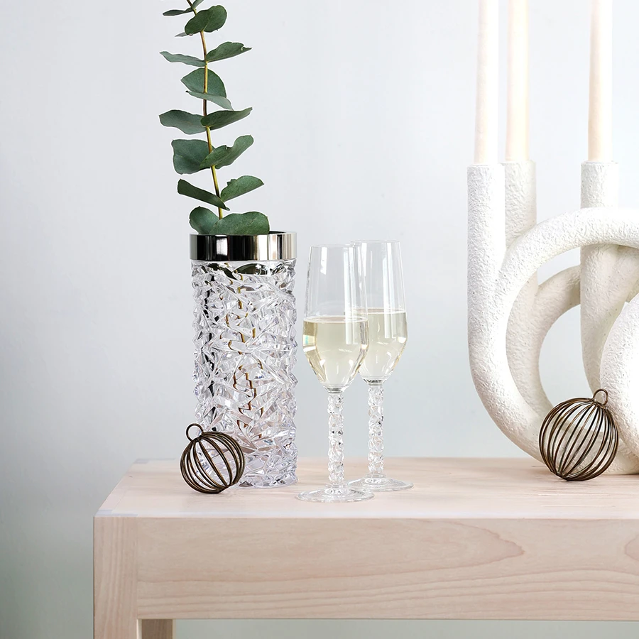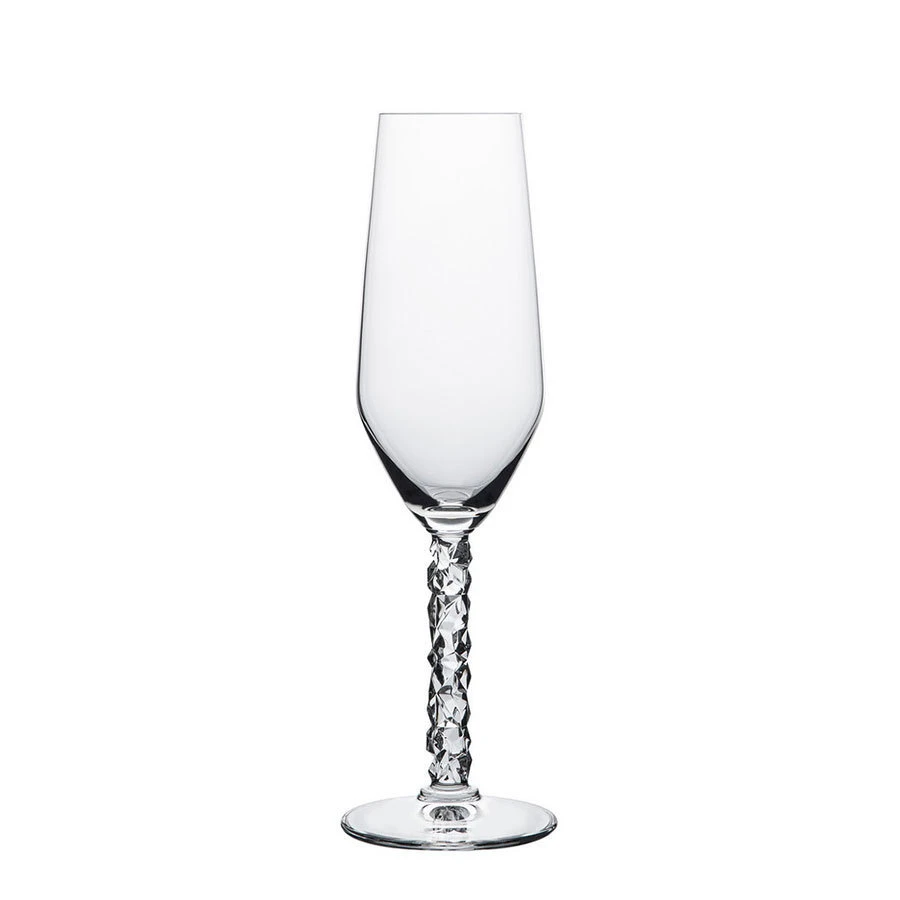 The Carat collection is based on a contemporary interpretation of the traditional cut glass for which Orrefors is world-renowned. Carat Champagne, available as a set of 2, has a stem covered with the collection’s characteristic asymmetrical motif, which produces beautiful reflections of light in the crystal. The champagne glass holds 8 oz and its flute shape makes it ideal for sparkling beverages, with the narrow bowl preserving the bubbles in the drink. Designed by Lena Bergström.