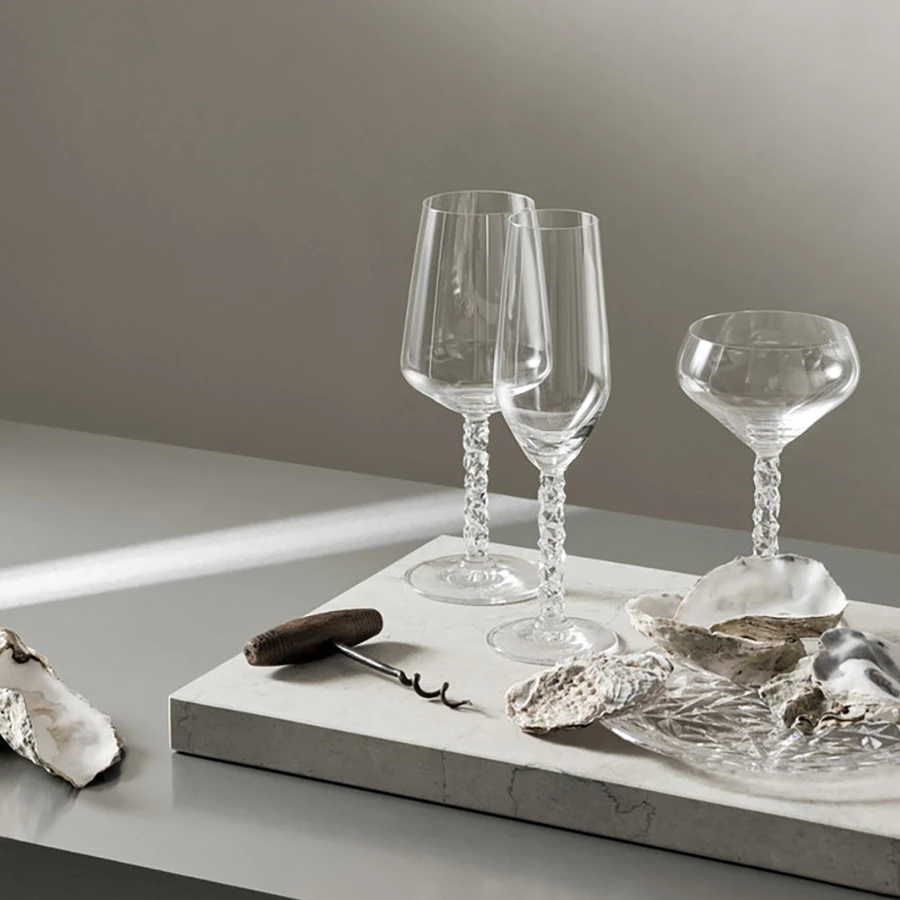 The Carat collection is based on a contemporary interpretation of the traditional cut glass for which Orrefors is world-renowned. Carat Wine, available as a set of 2, has a stem covered with the collection’s characteristic asymmetrical motif, which produces beautiful reflections of light in the crystal. The wine glass holds 14.8 oz and is designed for all beverages but is particularly well-suited for wine. Designed by Lena Bergström.