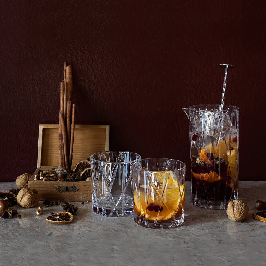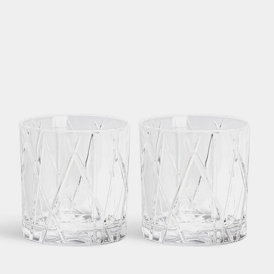 City Double Old Fashioned from Orrefors, available as a set of 2, holds 11 oz and is ideal for serving spirits and cocktails. The cuts that criss-cross the surface of the glass create an asymmetric look, which contributes to the distinct identity of the collection. Designed by Martti Rytkönen.