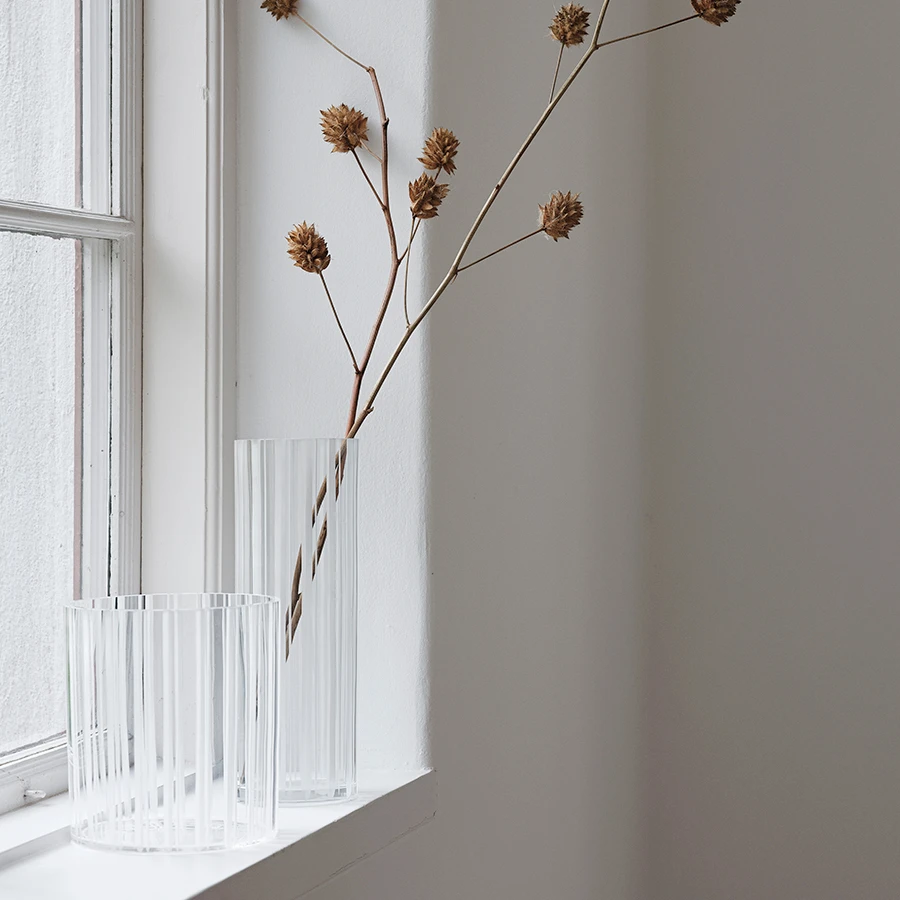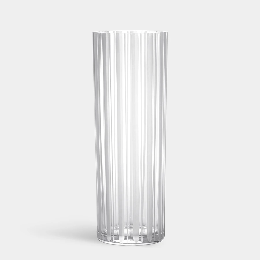 The tall cylinder vase with a stripe motif in the Cut In Number collection from Orrefors is ideal for long stem flowers. The satin finished cuts on the vase beautifully emphasize the transparency of the clear crystal. Designed by Ingegerd RÃ¥man.