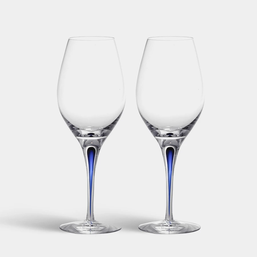Intermezzo Balance from Orrefors was designed in 1984. The glass holds 14 oz and suits all kinds of wine, including white, red, and rosé. The tulip shape of the bowl brings out the flavors and aromas of the wine particularly well. Intermezzo Balance is mouth-blown in Sweden by expert glassblowers and has a drop of blue sealed inside the stem – an innovation based on traditional craftsmanship. Designed by Erika Lagerbielke.