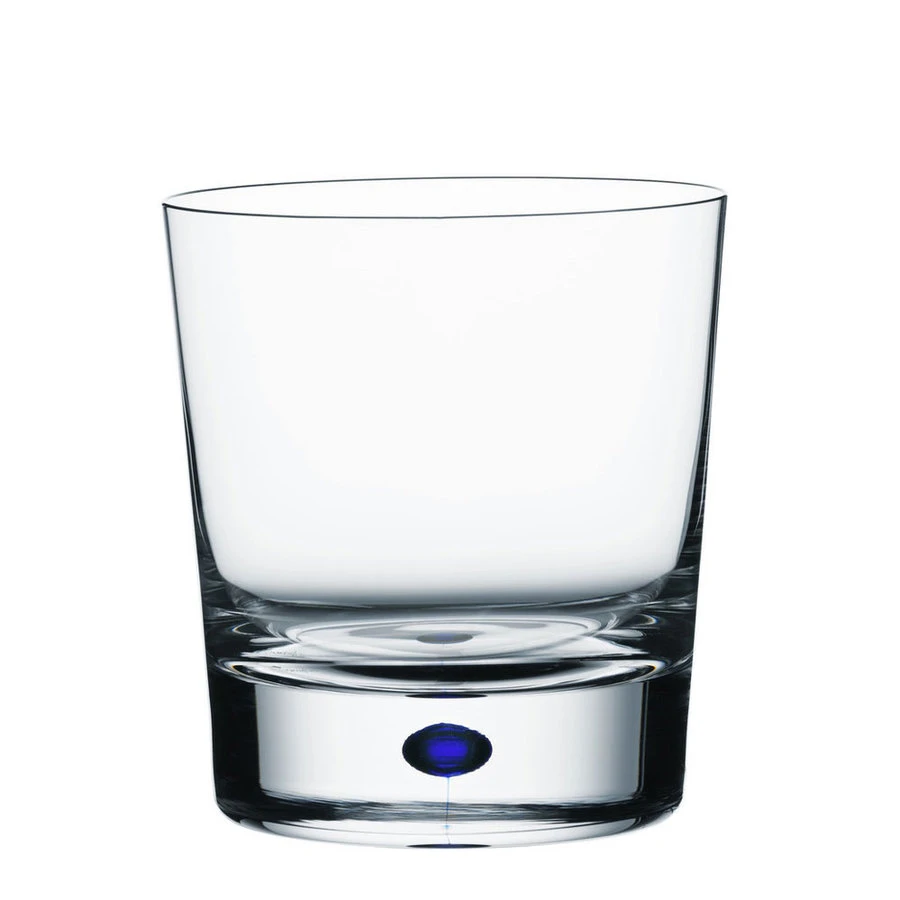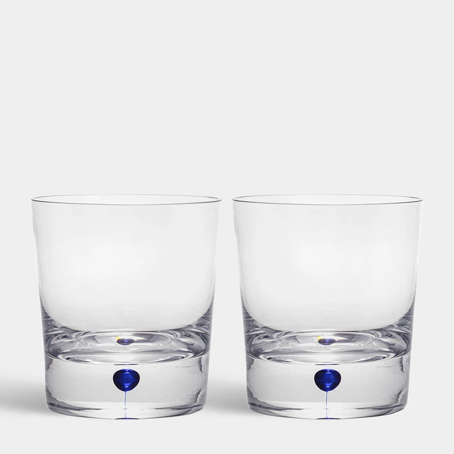 Intermezzo Double Old Fashioned from Orrefors was designed in 1984. The glass, available as a set of 2, holds 11 oz and is ideal for serving spirits or cocktails with space for plenty of ice, juices, and drink mixers. Intermezzo DOF is mouthblown in Sweden by expert glassblowers and has a drop of blue sealed in the bottom – an innovation based on traditional glass craftsmanship. Designed by Erika Lagerbielke.