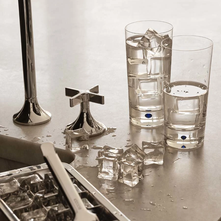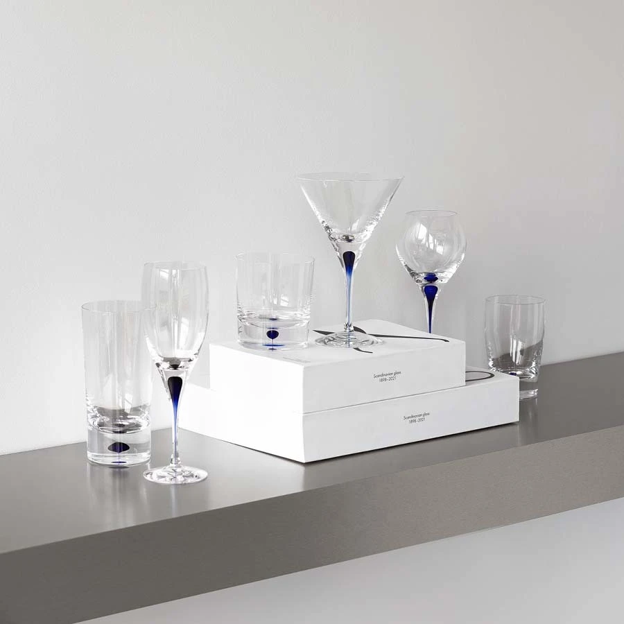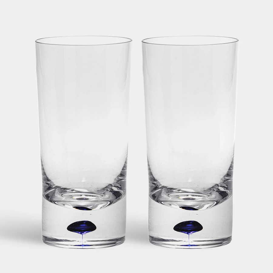 Intermezzo Tumbler from Orrefors was designed in 1984. The glass, available as a set of 2, holds 13 oz and is intended as a highball glass for mixed drinks, with or without alcohol. Intermezzo Tumbler is mouthblown in Sweden by expert glassblowers and has a drop of blue sealed in the bottom – an innovation based on traditional glass craftsmanship. Designed by Erika Lagerbielke.