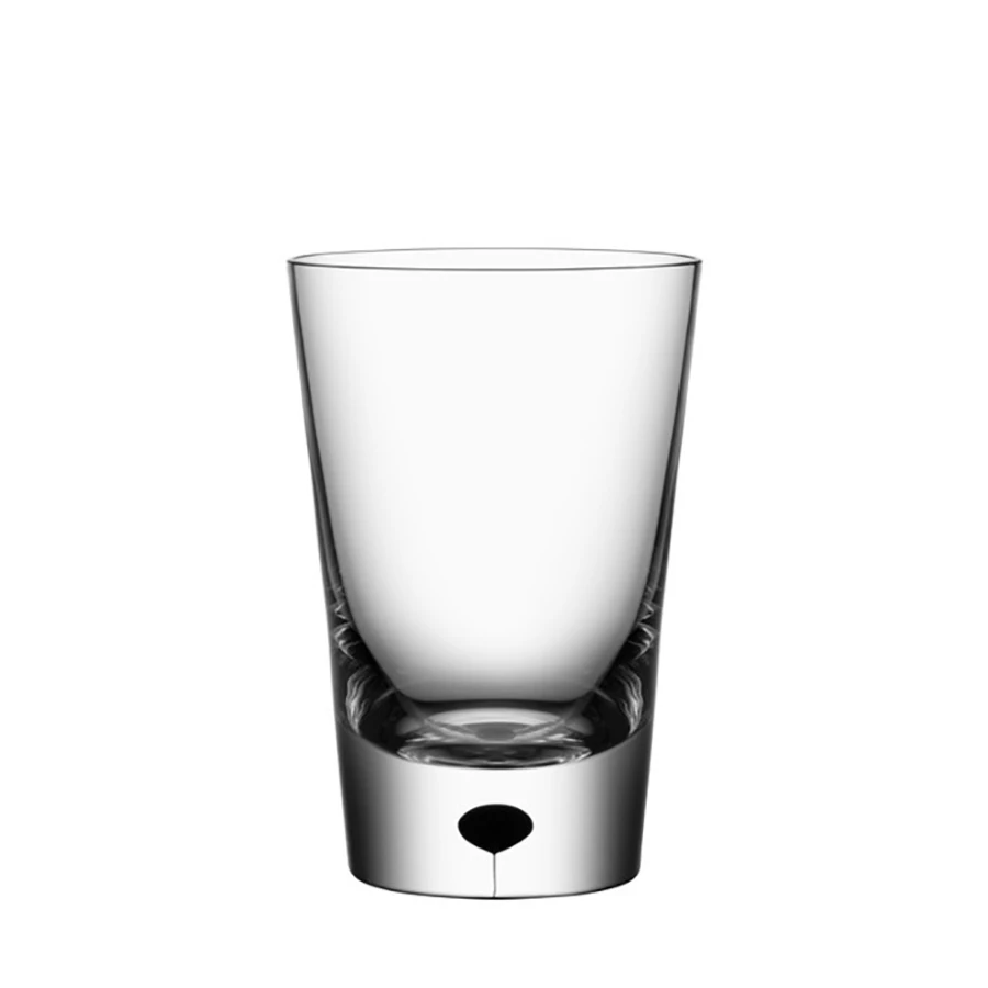 Metropol Tumbler from Orrefors, available as a set of 2, holds 8 oz and is an all-purpose glass ideal for a wide variety of drinks. It is a great complement to the wine glasses in the collection if used as a water glass. The tumbler is mouth-blown in Sweden by expert glassblowers and inspired by Erika Lagerbielke’s classic Intermezzo design, but with a more angular and austere shape and a drop of black sealed inside the base.