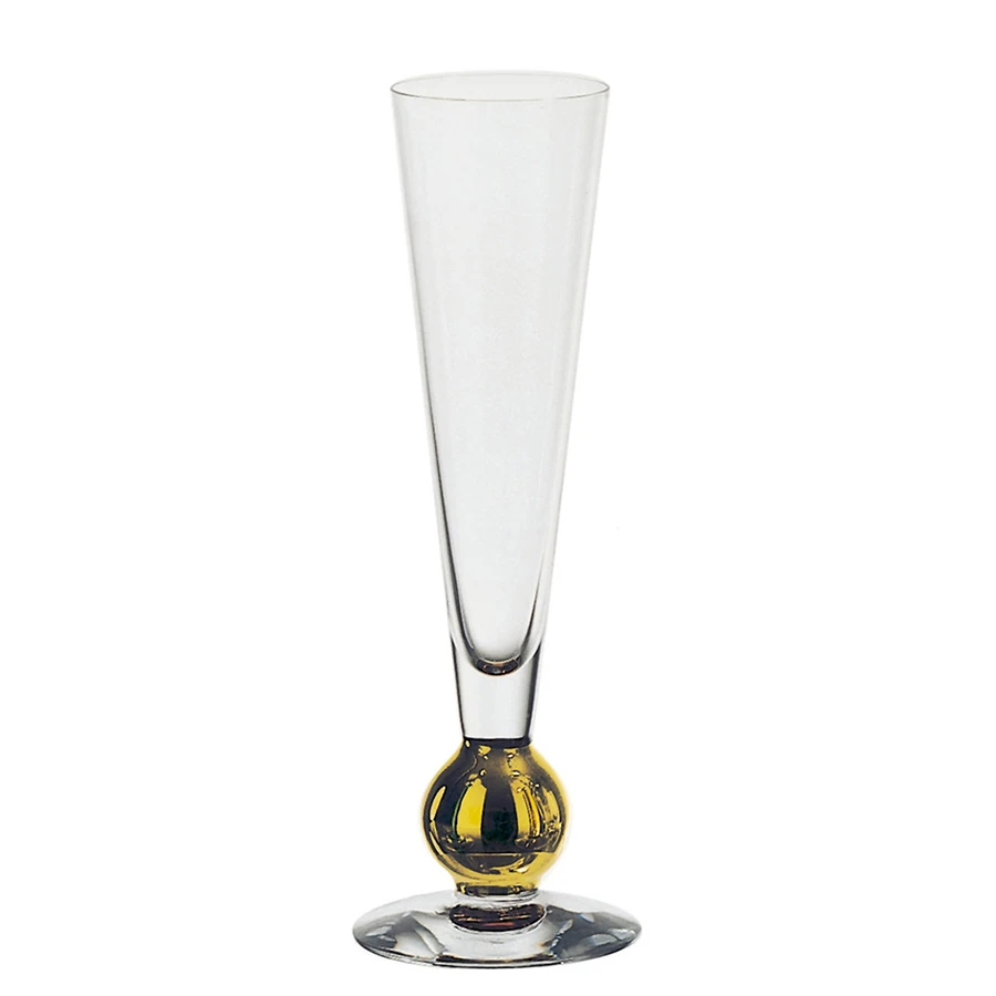 In 1991, Gunnar Cyrén designed the Nobel flute for the 90th anniversary of the Nobel Prize. The crystal champagne glass is hand-painted with details in real 21 karat gold. The bowl, which holds 6 oz, has a long and narrow shape to preserve the bubbles in sparkling beverages. To this day, Nobel Prize-winners and royalty use the champagne glasses from the Orrefors Nobel collection every December at Stockholm City Hall.