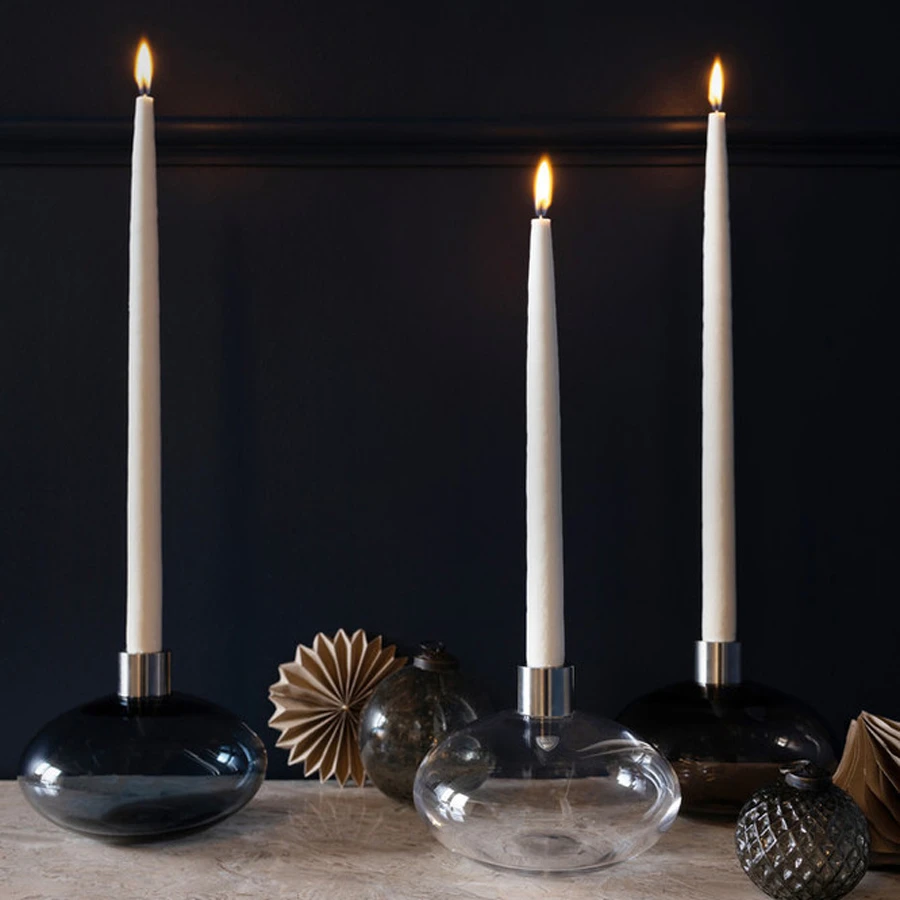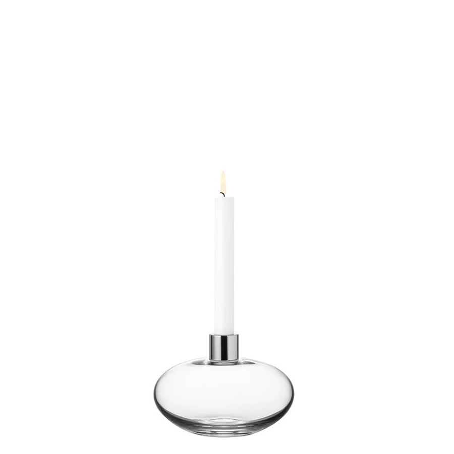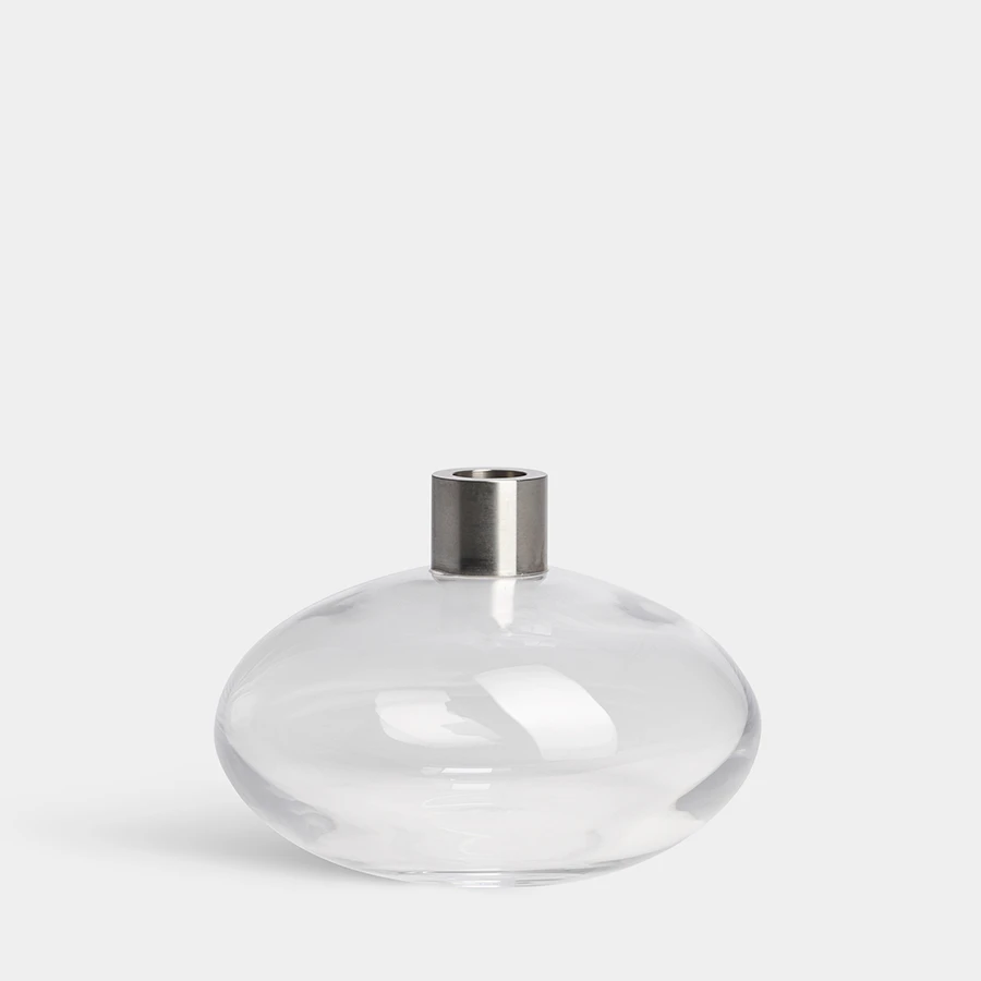 Pluto Candlestick from Orrefors in clear crystal has a minimalist, spherical shape influenced by Pluto – the heavenly body categorized as a dwarf planet. The candlestick holder is mouth-blown and has details in stainless steel. Designed by Lena Bergström.