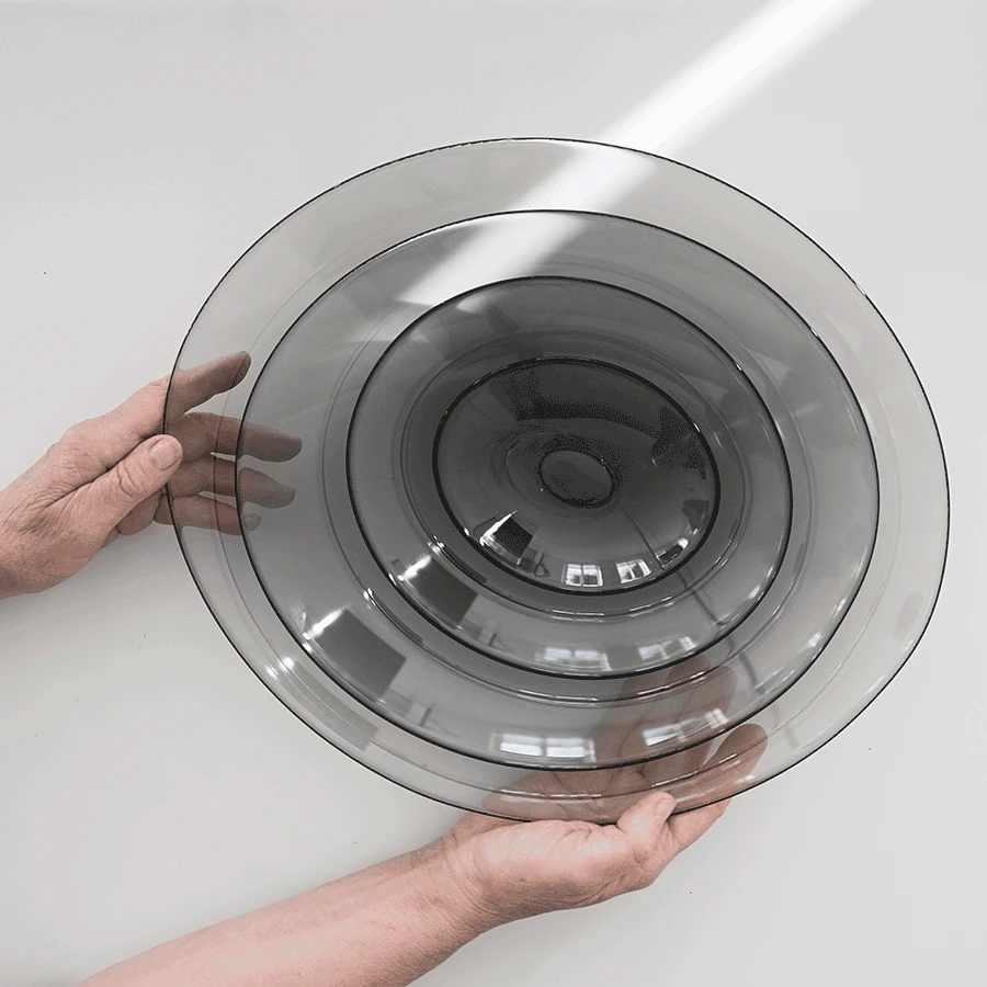 The Pond collection consists of serving dishes in four different sizes. Each item is produced with a technique called centrifuging, which was invented and patented by glass designer Sven Palmqvist at Orrefors glassworks in 1951. The medium Pond dish is decorative as well as functional. Designed by Ingegerd Råman.