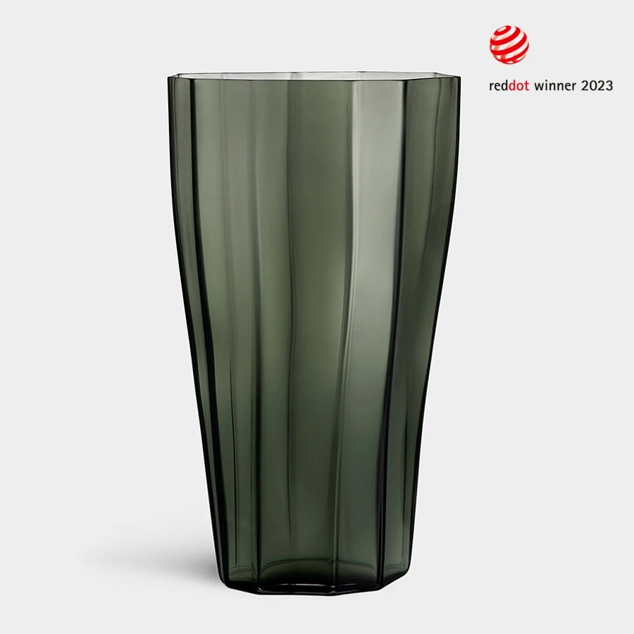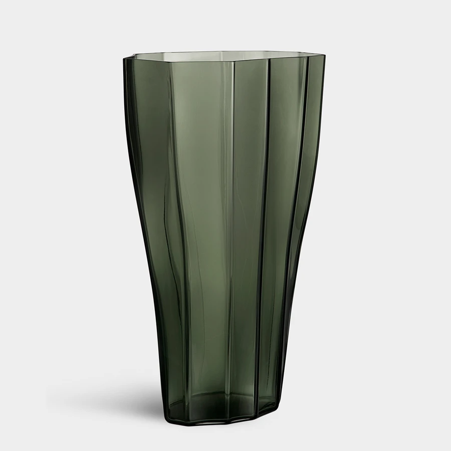 With Reed, Swedish designer Monica Förster shows how to create a sense of organic movement by emphasizing folds. A quiet sway in the solid, moss green glass. The large Reed can be placed on the floor and in spacious rooms as a vessel for large greens and florals.