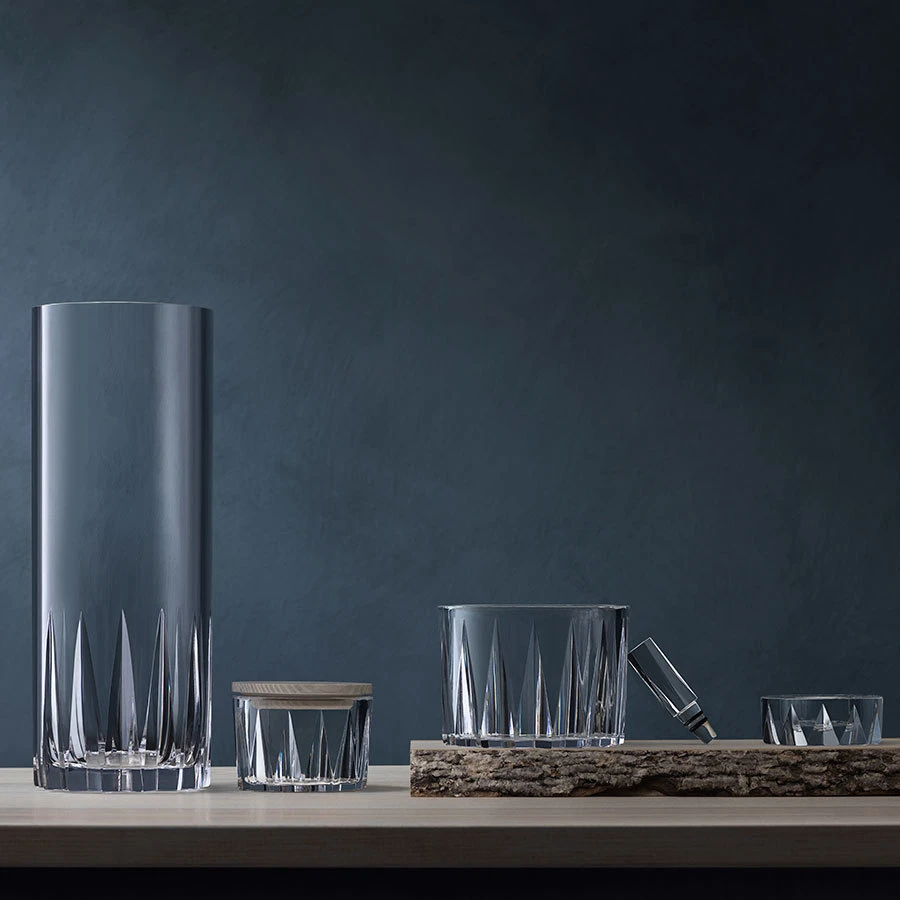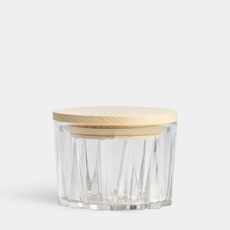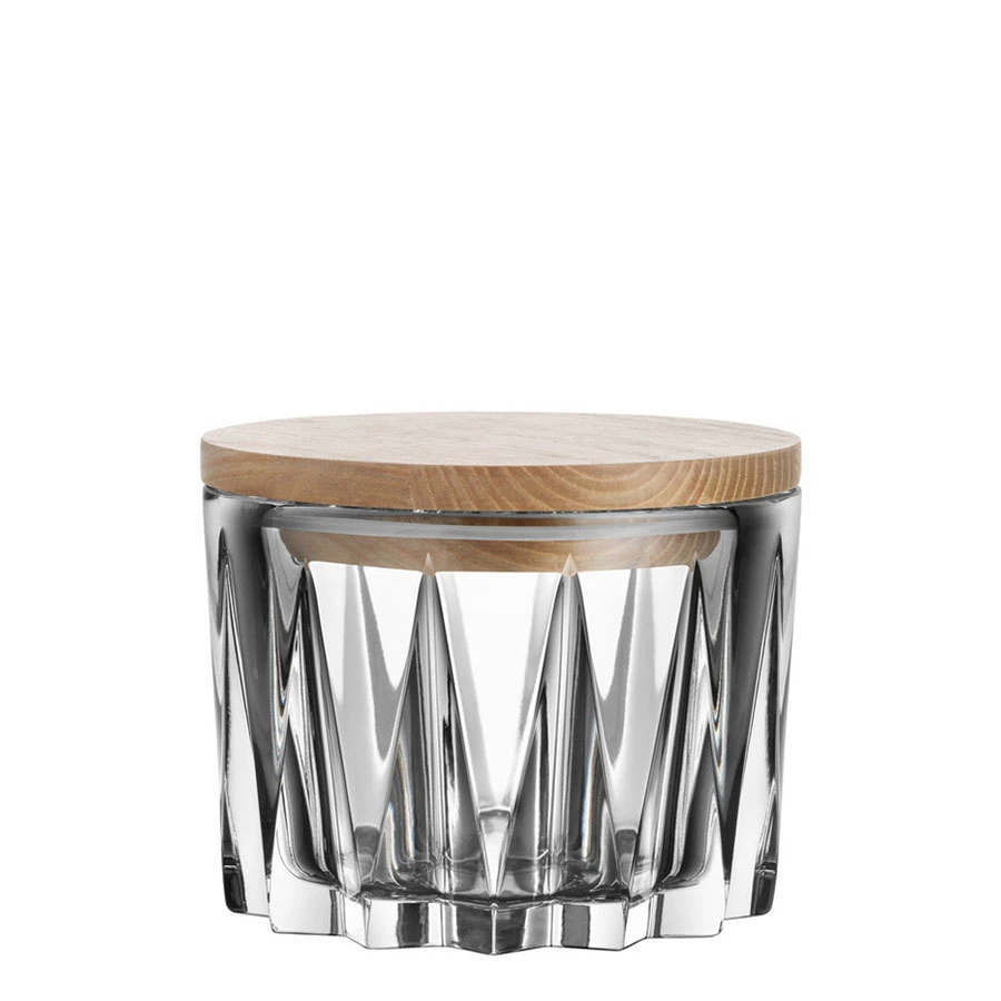 Sarek from Orrefors has deep-cut facets inspired by the motif on wooden baskets made of plaited birch bark, which has a symbolic connection to Swedish nature. The small crystal bowl has a lid in pale ash wood, providing contrast to the clear glass. Designed by Lena Bergström.
