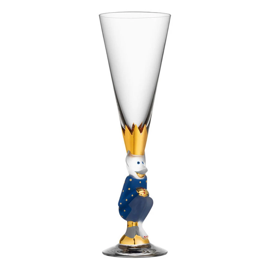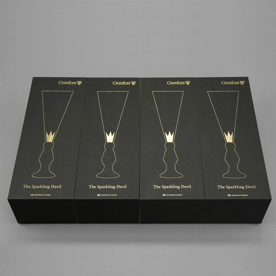 Gunnar Cyrén was the talented designer behind the Nobel collection. In 2013, his sons found several sketches of never launched champagne glasses inspired by the snaps glasses in the Nobel collection from Orrefors. The selected design has resulted in luxurious stemware glasses in different color variations. The Sparkling Devil in blue, which holds 6.5 oz, is mouth-blown in Sweden with hand-painted details in real 21 karat gold.