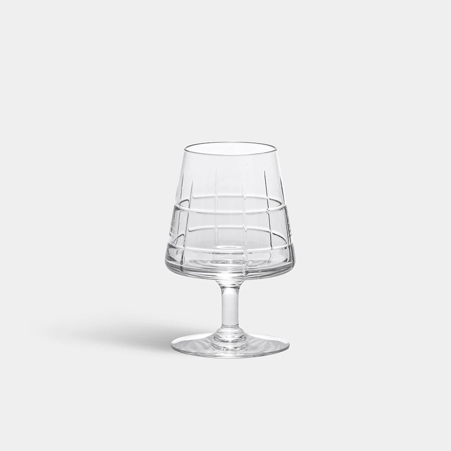 Street Cognac from Orrefors holds 5 oz and is ideal for cognac, as well as other barrel-aged spirits. The stemware glass has a checked motif of straight lines inspired by the criss-cross streets and avenues of Manhattan, New York.
