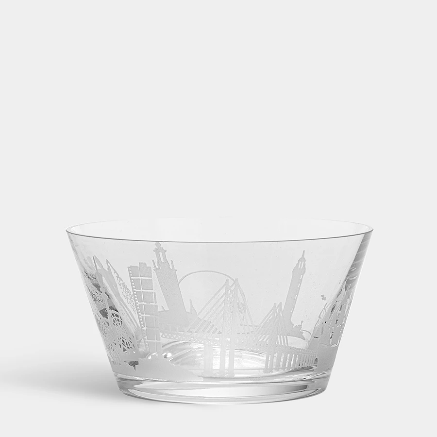 The Sweden Cities bowl is covered with sand-blasted symbols of landmarks from famous major Swedish cities such as Stockholm, Gothenburg, and Malmö. The bowl is ideal for snacks. Designed by Emma Ekberg.
