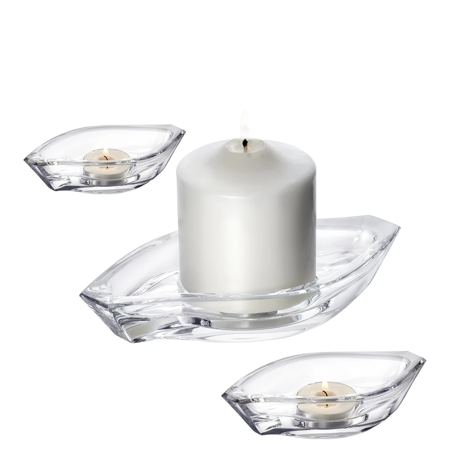 Wave 3 Piece Set by Orrefors Designs consists of two votive holders and one pillar candle holder with a shape influenced by the ocean. The candle holders are made of clear crystal.
